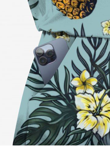 Plus Size Tropical Leaf Hibiscus Flower Pineapple Print Hawaii Drawstring Pocket Romper - Blue - M