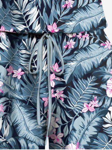 Plus Size Tropical Leaf Hibiscus Flower Print Cinched Hawaii Romper - Blue - Xs