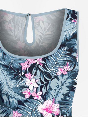 Plus Size Tropical Leaf Hibiscus Flower Print Cinched Hawaii Romper - Blue - 1x