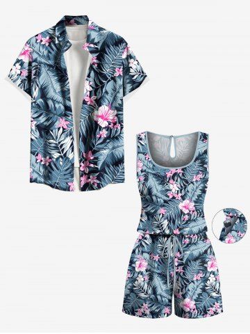 Plus Size Tropical Leaf Hibiscus Flower Print Cinched Hawaii Romper - Blue - 2x
