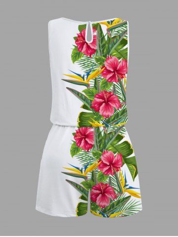 Plus Size Tropical Leaf Hibiscus Flower Print Cinched Hawaii Romper - White - S