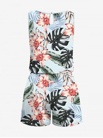Plus Size Tropical Leaf Hibiscus Flower Print Hawaii Drawstring Pocket Romper - Light Blue - Xxs