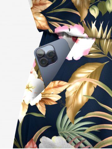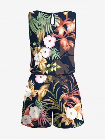 Plus Size Tropical Leaf Hibiscus Flower Print Hawaii Drawstring Pocket Romper - Black - S