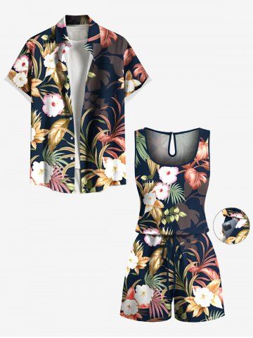 Graphic Pants > Plus Size Tropical Leaf Hibiscus Flower Print Hawaii Drawstring Pocket Romper