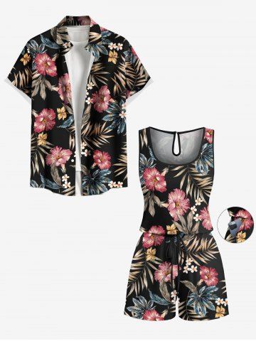 Plus Size Tropical Leaf Hibiscus Flower Print Hawaii Drawstring Pocket Romper - Black - 5x