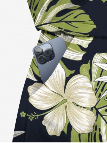 Plus Size Tropical Leaf Hibiscus Flower Print Hawaii Drawstring Pocket Romper - Black - L