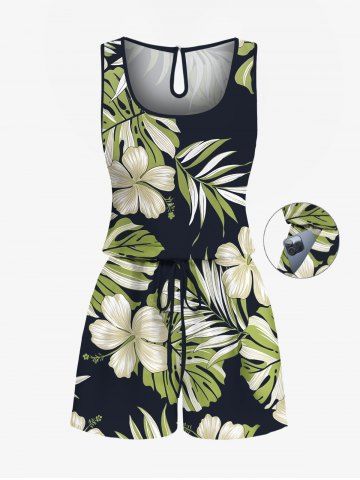 Graphic Pants > Plus Size Tropical Leaf Hibiscus Flower Print Hawaii Drawstring Pocket Romper