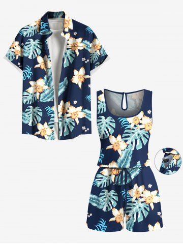 Graphic Pants > Plus Size Tropical Leaf Hibiscus Flower Print Hawaii Drawstring Pocket Romper