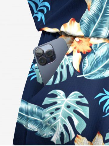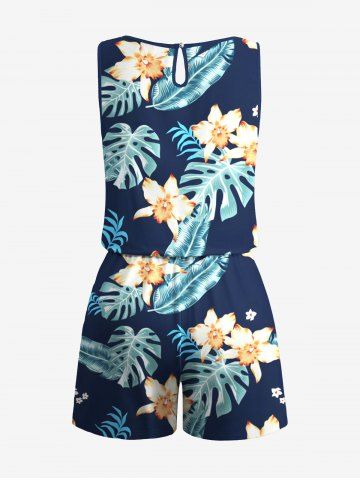 Plus Size Tropical Leaf Hibiscus Flower Print Hawaii Drawstring Pocket Romper - Deep Blue - 4x