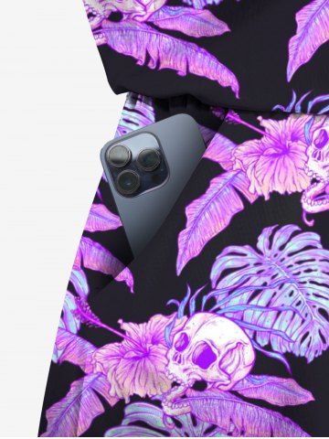 Plus Size Tropical Leaf Hibiscus Flower Skulls Print Cinched Hawaii Romper - Black - S