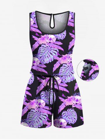 Graphic Pants > Plus Size Tropical Leaf Hibiscus Flower Skulls Print Cinched Hawaii Romper