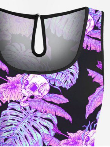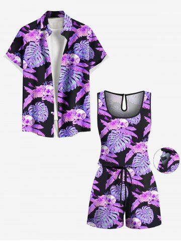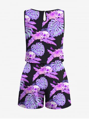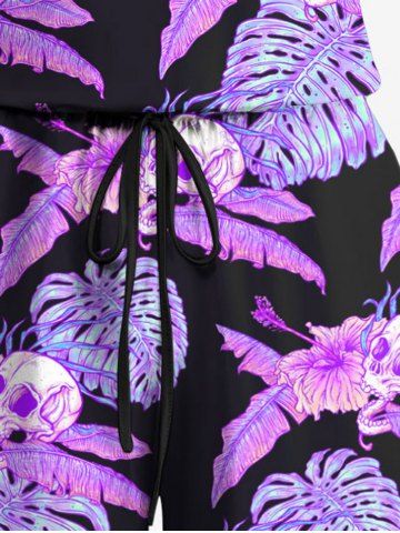 Graphic Pants > Plus Size Tropical Leaf Hibiscus Flower Skulls Print Cinched Hawaii Romper