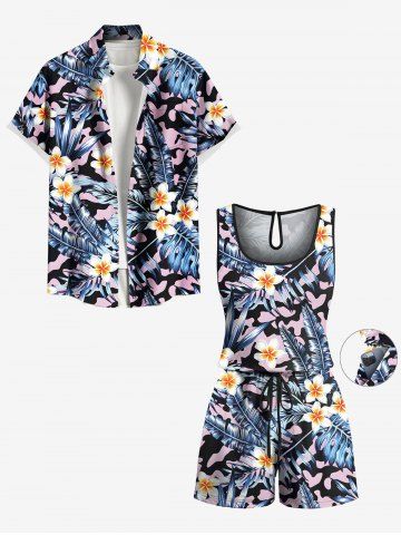 Graphic Pants > Plus Size Tropical Leaf Hibiscus Flowers Print Cinched Hawaii Romper