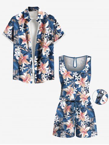 Plus Size Tropical Leaf Hibiscus Flowers Print Cinched Hawaii Romper - Blue - S