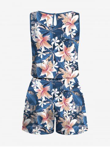 Plus Size Tropical Leaf Hibiscus Flowers Print Cinched Hawaii Romper - Blue - 5x