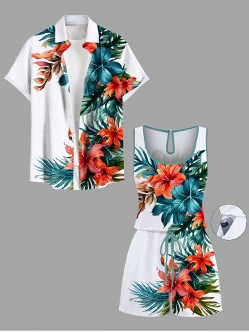 Matching Hawaii Shirt and Romper Plus Size Beach Outfit Tropical Leaf Hibiscus Printed for Couples