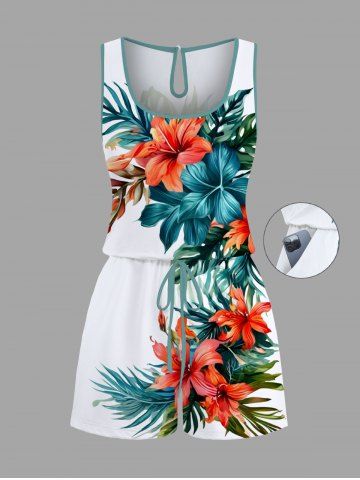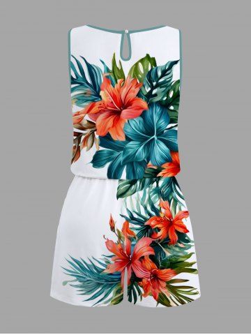 Plus Size Tropical Leaf Hibiscus Flowers Print Cinched Hawaii Romper - White - Xxs