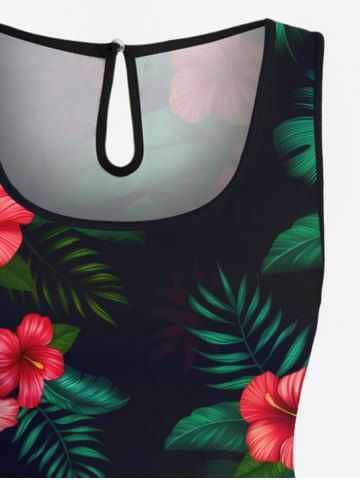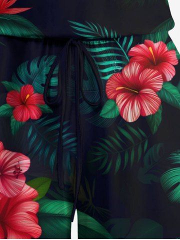 Plus Size Tropical Leaf Hibiscus Flowers Print Cinched Hawaii Romper - Black - S