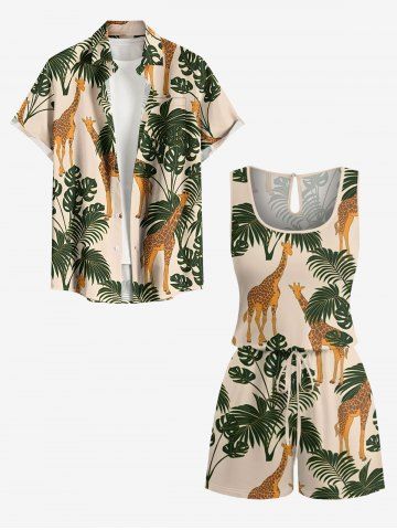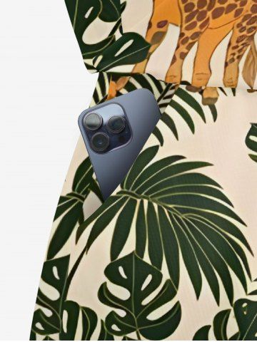 Plus Size Tropical Leaf Plant Giraffe Print Hawaii Drawstring Pocket Romper - Light Coffee - 3x