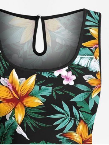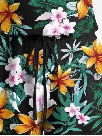 Plus Size Tropical Leaf Flower Branch Print Hawaii Drawstring Pocket Romper - Black - Xs