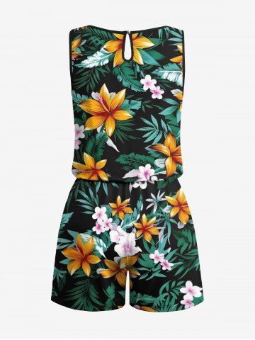 Graphic Pants > Plus Size Tropical Leaf Flower Branch Print Hawaii Drawstring Pocket Romper