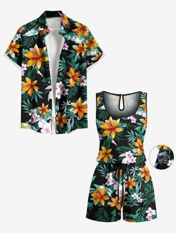 Graphic Pants > Plus Size Tropical Leaf Flower Branch Print Hawaii Drawstring Pocket Romper