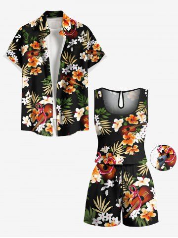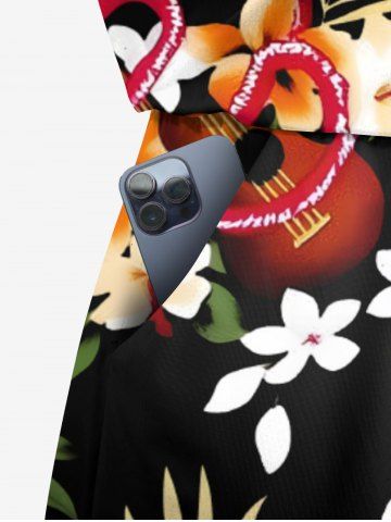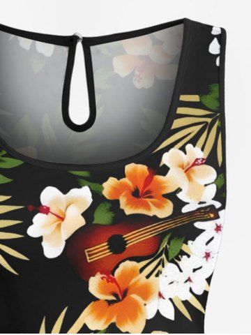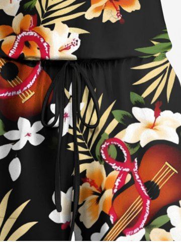 Plus Size Tropical Leaves Floral Guitar Print Hawaii Drawstring Pocket Romper - Black - Xxs