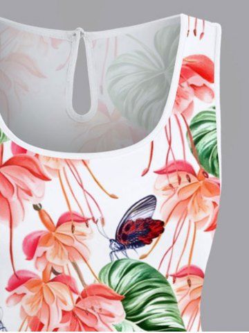 Plus Size Tropical Leaf Flower Insects Print Hawaii Drawstring Pocket Romper - White - Xxs