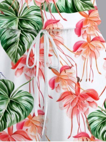 Plus Size Tropical Leaf Flower Insects Print Hawaii Drawstring Pocket Romper - White - Xs
