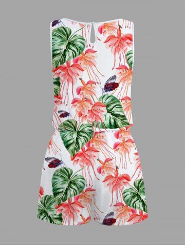 Plus Size Tropical Leaf Flower Insects Print Hawaii Drawstring Pocket Romper - White - M