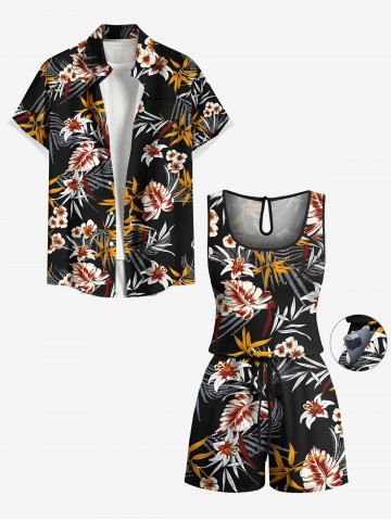 Plus Size Tropical Leaves Floral Print Hawaii Drawstring Button Jumpsuit - Black - 2x