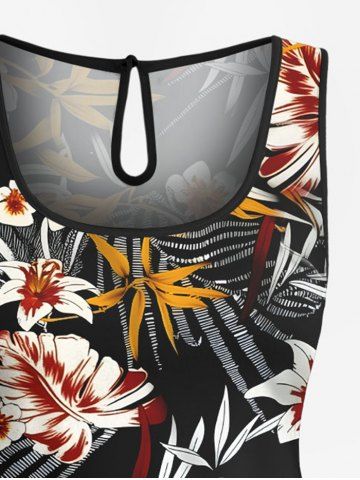 Plus Size Tropical Leaves Floral Print Hawaii Drawstring Button Jumpsuit - Black - 3x