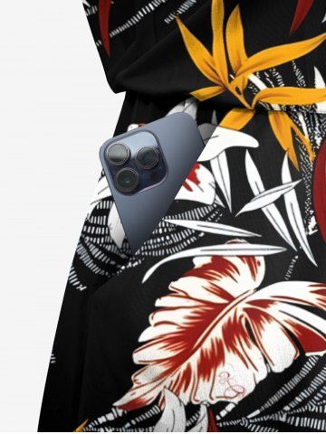 Plus Size Tropical Leaves Floral Print Hawaii Drawstring Button Jumpsuit - Black - 5x
