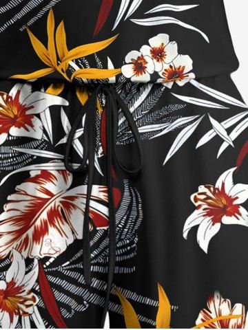 Graphic Pants > Plus Size Tropical Leaves Floral Print Hawaii Drawstring Button Jumpsuit