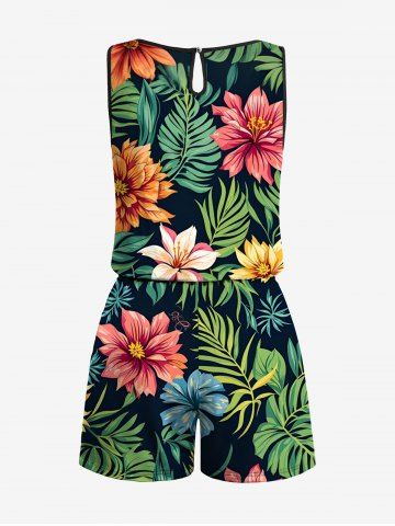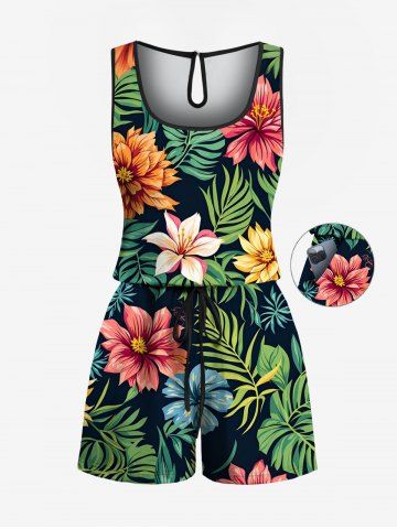 Graphic Pants > Plus Size Tropical Leaves Floral Print Hawaii Drawstring Pocket Romper
