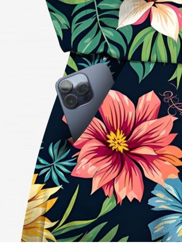 Plus Size Tropical Leaves Floral Print Hawaii Drawstring Pocket Romper - Black - Xs