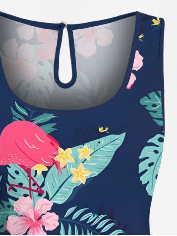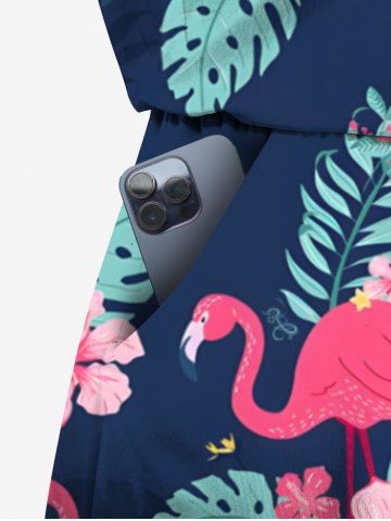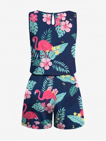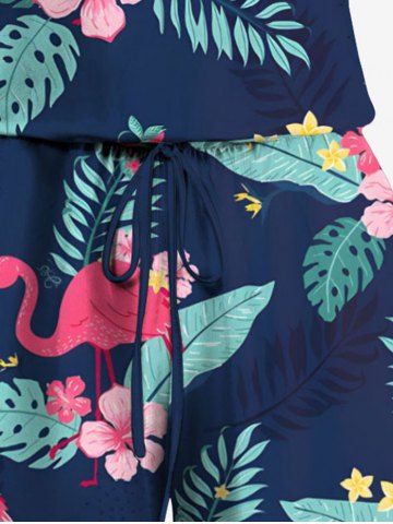 Plus Size Tropical Leaf Hibiscus Flower Flamingo Print Hawaii Pocket Drawstring Romper - Black - M