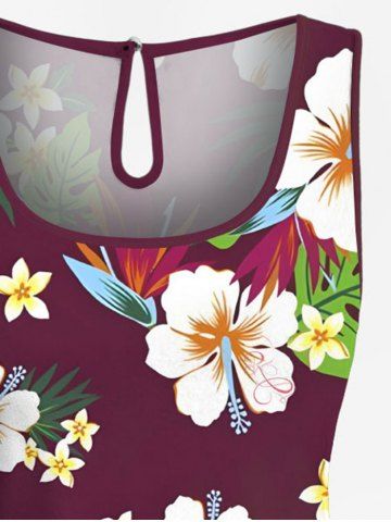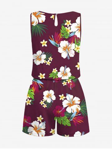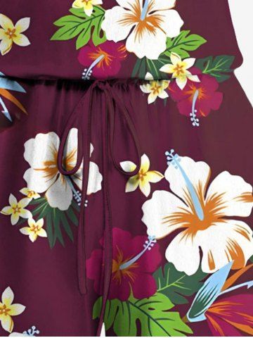 Plus Size Tropical Leaf Hibiscus Flower Print Hawaii Drawstring Pocket Romper - Deep Red - 3x