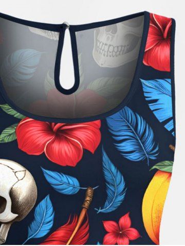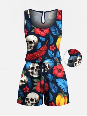 Graphic Pants > Plus Size Tropical Leaf Hibiscus Flower Skull Print Hawaii Drawstring Pocket Romper