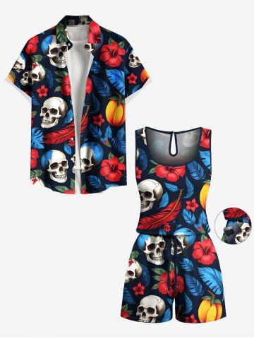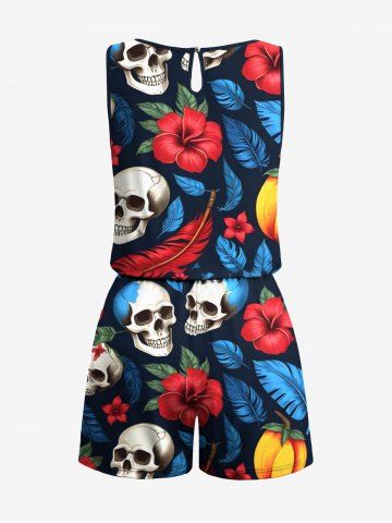 Graphic Pants > Plus Size Tropical Leaf Hibiscus Flower Skull Print Hawaii Drawstring Pocket Romper