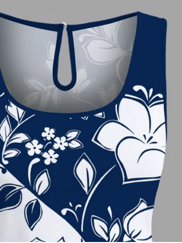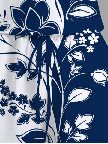 Plus Size Two Tone Floral Branch Curve Print Hawaii Drawstring Pocket Romper - Deep Blue - M