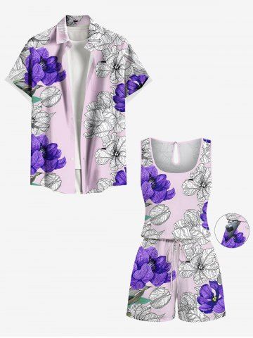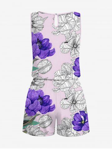Plus Size Two Tone Floral Print Hawaii Drawstring Pocket Romper - Light Purple - M