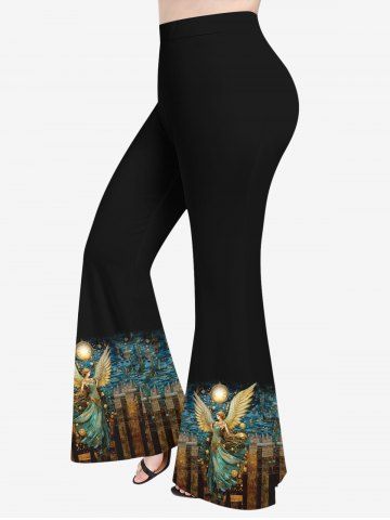 Renaissance Plus Size Vintage Angel Wings Castle Clock Print Flare Pants - Black - 5x
