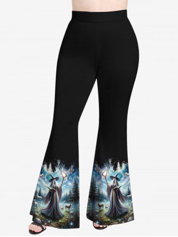 Plus Size Wizard Grassland Elk Pigeon Sky Print Ombre Flare Pants - Black - 5x