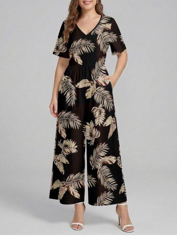 Graphic Pants > Tropical Leaf Print V Neck Hawaii Wide Leg Jumpsuit