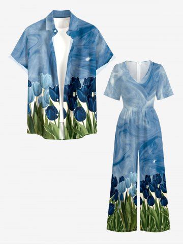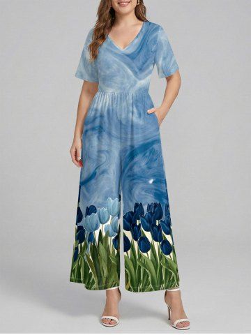 Tulip Flower Painting Print Hawaii Wide Leg Jumpsuit - Sky Blue - 3xl