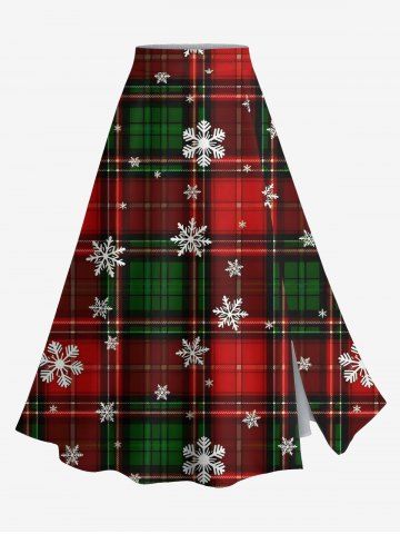 Plus Size Christmas Snowflake Plaid Print Split A Line Skirt - Cherry Red - 5x