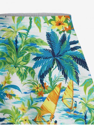 Plus Size Coconut Tree Hibiscus Flower Sea Surfer Print Hawaii Split A Line Skirt - Green - S