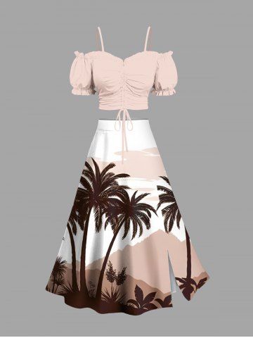 Plus Size Coconut Tree Mountain Cloud Print Hawaii Split A Line Skirt - Coffee - Xs