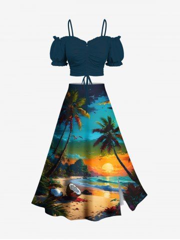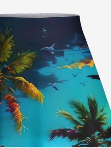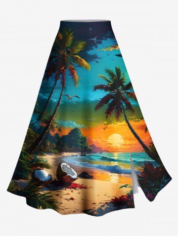 Plus Size Coconut Tree Sea Beach Seascape Print Hawaii Split A Line Skirt - Green - 1x